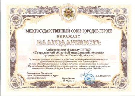 В сентябре коллектив Асбестовского филиала ГБПОУ "СОМК" в рамках реализации проекта «Центры гражданского и патриотического воспитания детей и молодежи «Мы наследники Великих Побед Отечества» приняли участие в проведении международного патриотического круглого стола Межгосударственного Союза Городов-Героев по теме «Центры гражданского и патриотического воспитания детей и молодежи «Мы наследники Великих Побед Отечества: создание, развитие, первый опыт работы», посвященного 80-летию Победы в Великой Отечественной войне 1941-1945 гг.