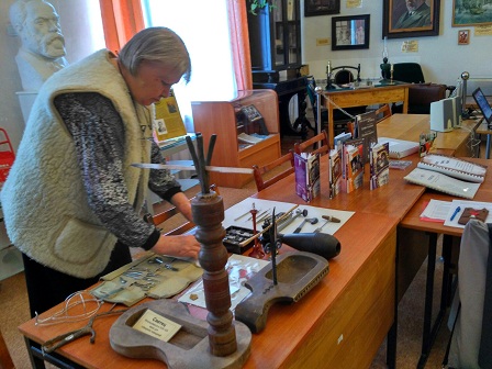 И посетили они музей не с пустыми руками! Замечательным подарком музею стала композиция "Военный врач на кратком отдыхе пишет письмо домой любимой жене", которую Александра Юрьевна изготовила с необыкновенным мастерством собственными руками, на заднем плане разместив строки письма Б. М. Корнилова домой.